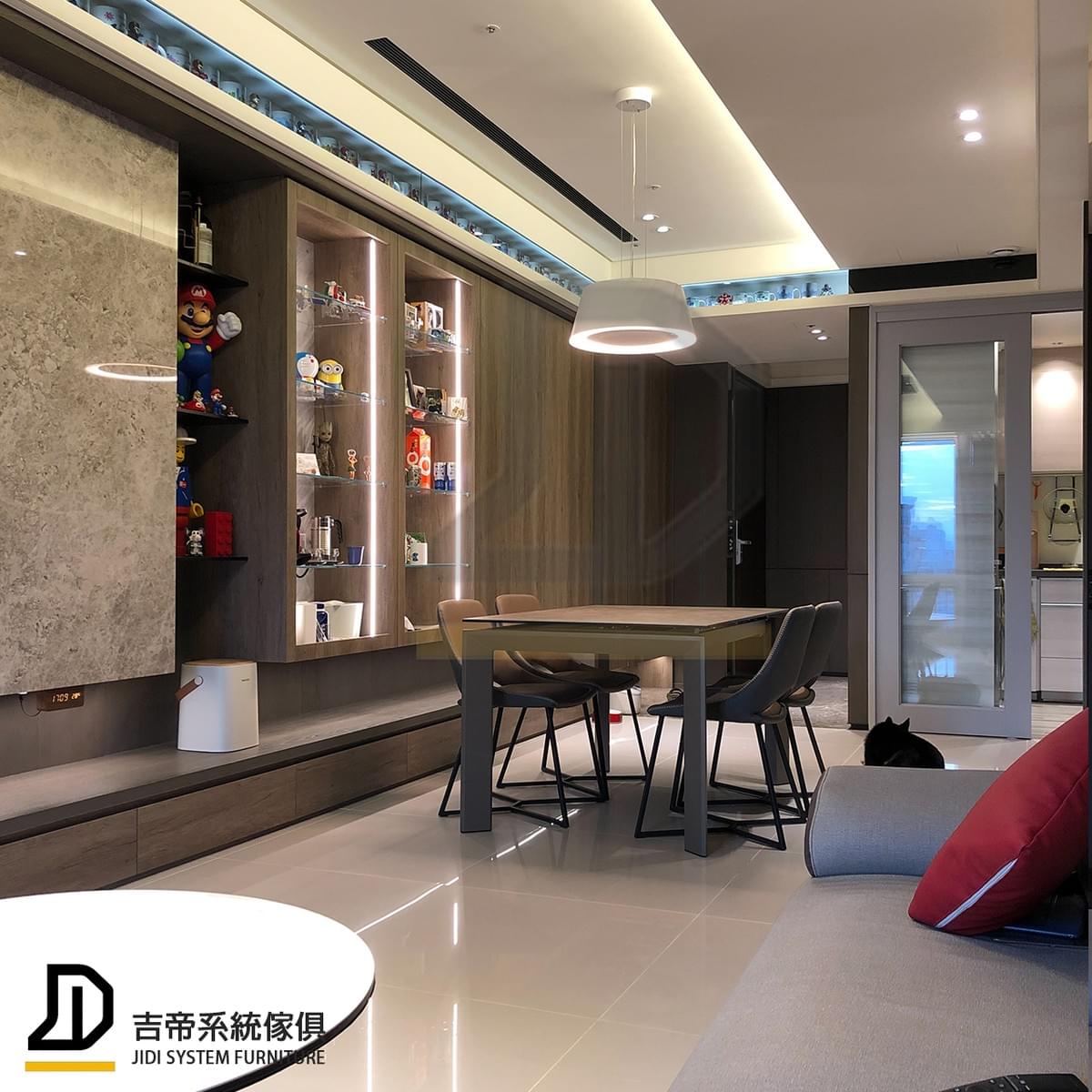 整體風格以現代沉穩調性為主,運用石材紋理電視牆、深木質櫃體與玻璃展示櫃,營造低調質感。